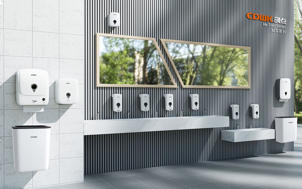 CDWK創點 公共衛生和平系列包括高速干手機、水劑噴香機、擦手紙巾盒、感應皂液器、智能魔鏡、公共垃圾桶等系列化產品,產品套裝具有現代感的無縫功能性設計,尤其適用于高端洗手間環境,既展現高端形象又便于清潔,是公共場所洗手間設備的品質之選。